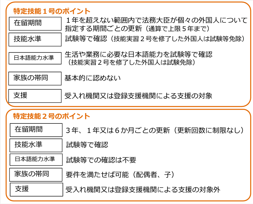 (16分野)専門的・技術的分野非専門的・非技術的分野「技能実習」「技術・人文知識・国際業務」「技能」「高度専門職(1号・2号)」「介護」「教授」等特定技能以外の在留資格特定技能の在留資格「特定技能1号」「特定技能2号」特定産業分野:介護、ビルクリーニング、工業製品製造業、建設、造船・舶用工業、自動車整備、航空、宿泊、自動車運送業、鉄道、農業、漁業、飲食料品製造業、外食業、林業、木材産業(赤字は特定技能2号でも受入れ可。青字は特定技能1号で受入れ可とする方針であり、省令等を改正する予定。)(「工業製品製造業」は省令等を改正するまでは引き続き「素形材・産業機械・電気電子情報関連製造業」として受入れ可。)